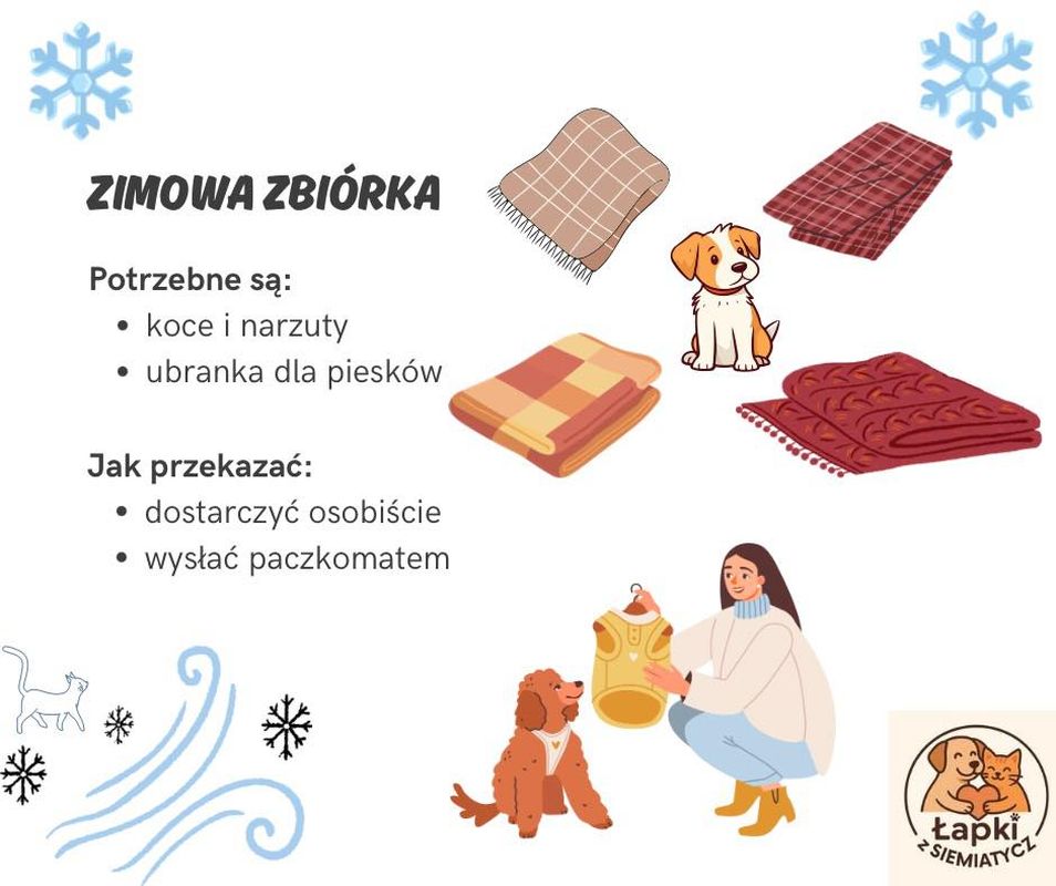 Koce w przytulisku wykorzystywane są na co dzień do ogrzewania psów przebywających w zewnętrznych boksach – jako uzupełnienie standardowego zabezpieczenia w postaci słomy – a także do przygotowania ciepłych i higienicznych legowisk dla szczeniąt oraz ich matki, przebywających w zamkniętych pomieszczeniach. Ze względu na intensywne użytkowanie koce szybko ulegają zabrudzeniu, zawilgoceniu lub zniszczeniu i wymagają częstej wymiany. Potrzebne są również ubranka dla psów, które pomogą im przetrwać najchłodniejsze dni.W ogłoszeniu, które opublikowano w mediach społecznościowych, poinformowano o potrzebach i poproszono o pomoc. Wszelkie wsparcie w postaci koców, narzut oraz ubranek dla psów może znacząco poprawić warunki bytowe zwierząt w siemiatyckim przytulisku.