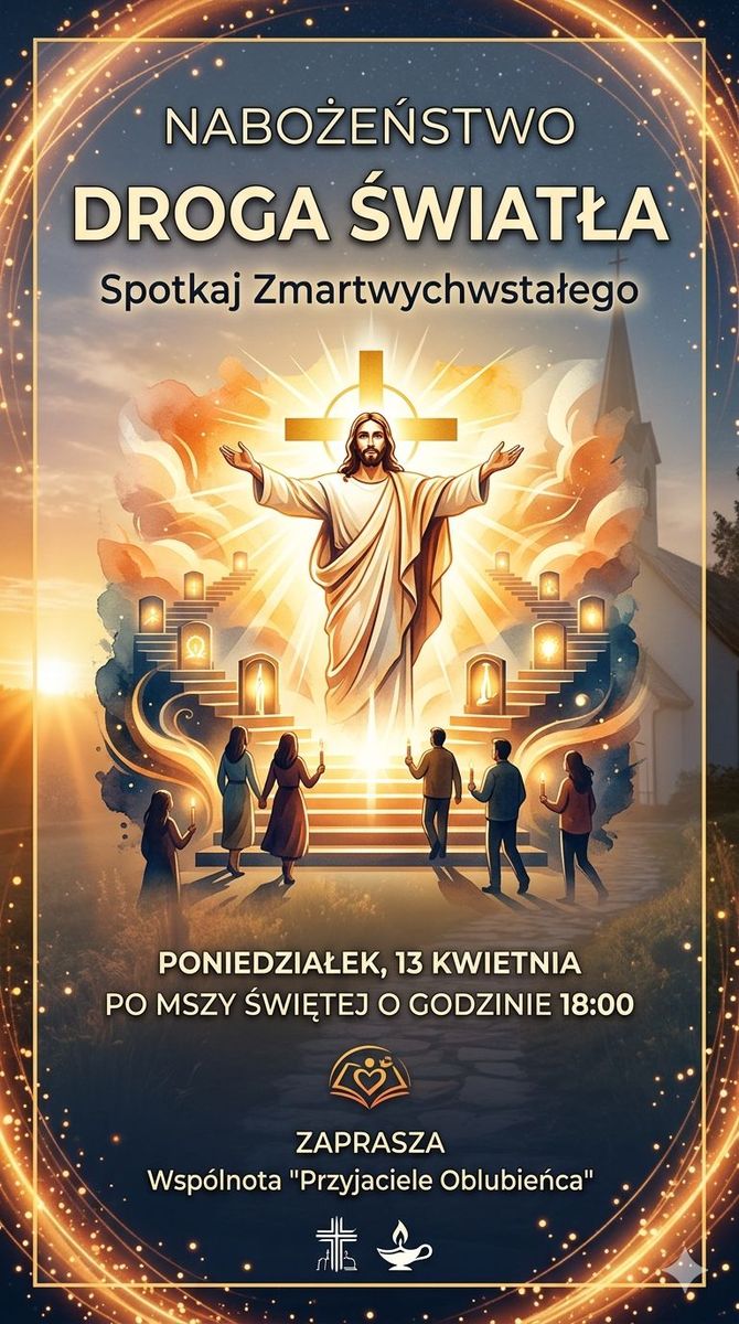 Droga Światła (łac. Via Lucis) to wielkanocne nabożeństwo, które często pojawia się w praktyce duszpasterskiej Kościoła. Wzorowane na Drodze Krzyżowej, koncentruje się jednak nie na męce, lecz na radości Zmartwychwstania. Prowadzi wiernych przez 14 stacji – od spotkania przy pustym grobie aż po Zesłanie Ducha Świętego – ukazując obecność Zmartwychwstałego Chrystusa w życiu uczniów.