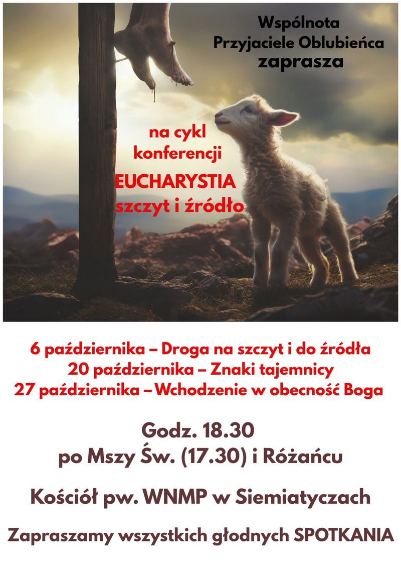 Pogłębiony cykl konferencji poświęconych Najświętszej Tajemnicy – Eucharystii organizowany jest przez Wspólnotę Przyjaciół Oblubieńca. Jak przypominają organizatorzy:- Zgodnie ze słowami Soboru Watykańskiego II, Eucharystia jest „źródłem i szczytem całego życia chrześcijańskiego”. Wierzymy, że jej głębsze zrozumienie i przeżywanie jest kluczem do autentycznej, owocnej wiary i bliskości z Chrystusem.