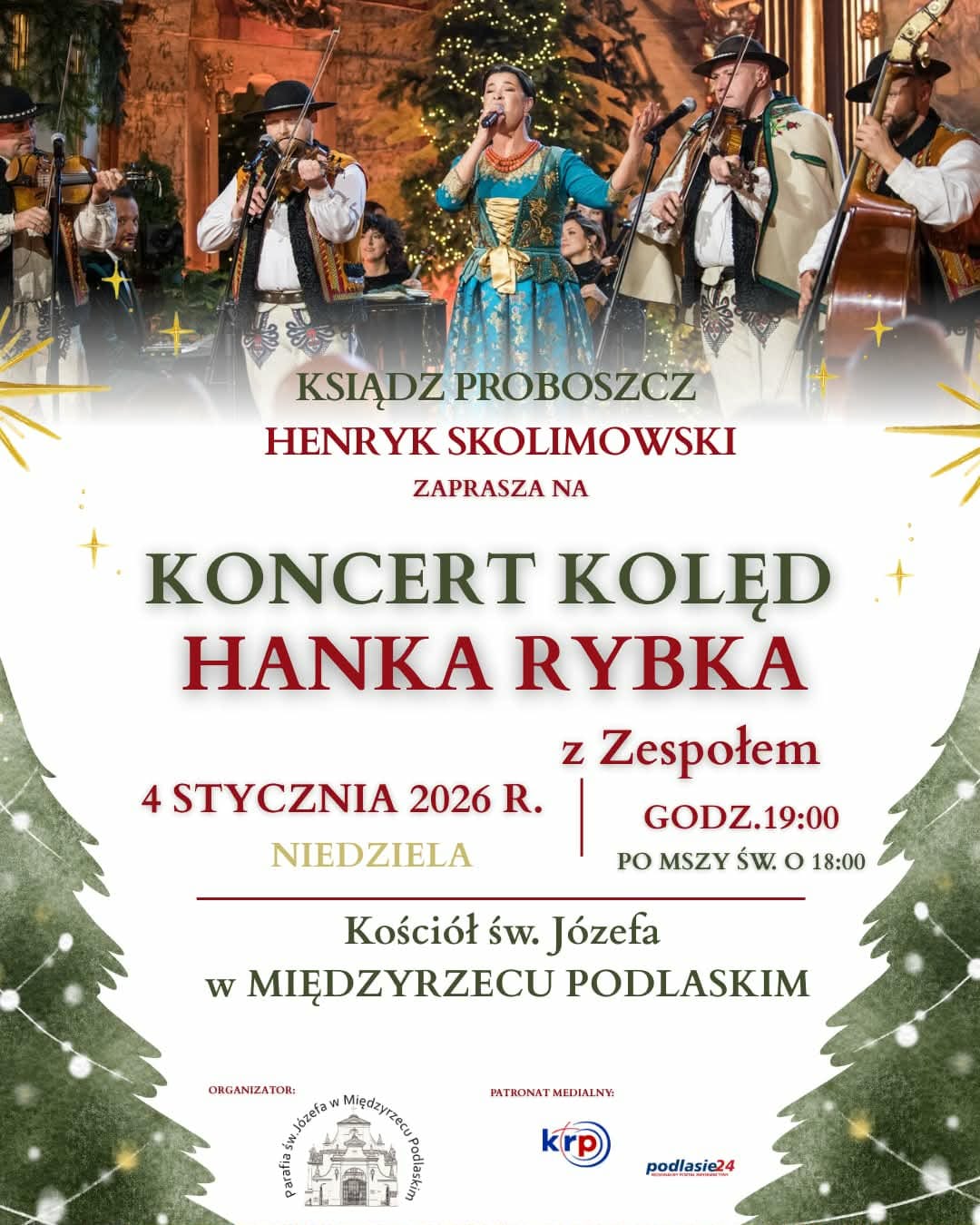 Wyjątkowy koncert kolęd odbędzie się już w najbliższą niedzielę, 4 stycznia 2026 roku, w kościele św. Józefa w Międzyrzecu Podlaskim. O godzinie 19.00, bezpośrednio po Mszy Świętej sprawowanej o 18.00, przed miejscową publicznością wystąpi wraz ze swoim zespołem Hanka Rybka – znana i ceniona artystka pochodząca z Podhala.