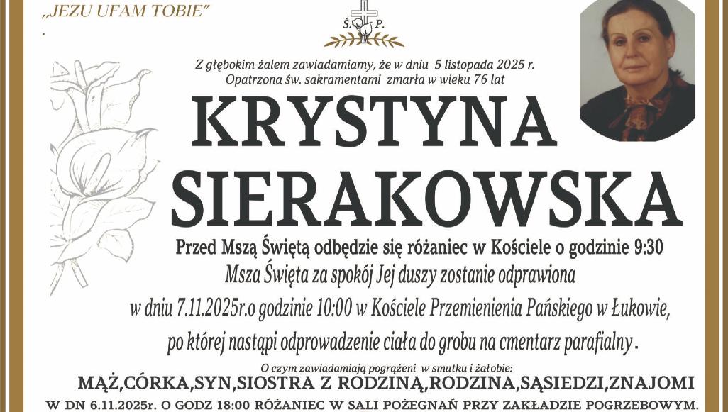 Msza Święta pogrzebowa zostanie odprawiona 7 listopada o godz. 10:00 w Kościele Przemienienia Pańskiego w Łukowie. Po Eucharystii nastąpi złożenie ciała do grobu na cmentarzu parafialnym.Różaniec w intencji śp. Krystyny Sierakowskiej odbędzie się 6 listopada o godz. 18:00 w Sali Pożegnań przy Zakładzie Pogrzebowym Charon oraz przed Mszą Świętą w kościele o godz. 9:30.