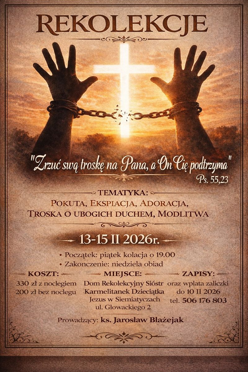 Rekolekcje będą czasem duchowego zatrzymania, modlitwy i refleksji. Ich tematyka obejmuje pokutę, ekspiację, adorację, troskę o ubogich duchem oraz modlitwę. To propozycja dla osób pragnących pogłębić swoją relację z Bogiem i odnaleźć umocnienie w codziennych trudnościach.Spotkanie rozpocznie się w piątek (13 lutego) kolacją o godz. 19:00, a zakończy w niedzielę (15 lutego) obiadem. Rekolekcje odbędą się w Domu Rekolekcyjnym Sióstr Karmelitanek Dzieciątka Jezus w Siemiatyczach, przy ul. Głowackiego 2.