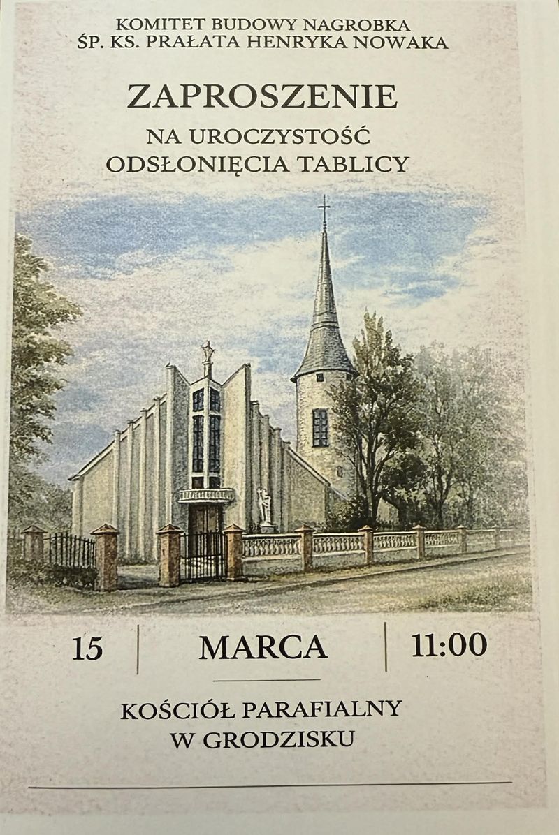 Do udziału w uroczystości zapraszają proboszcz parafii w Grodzisku, wójt gminy Grodzisk oraz członkowie Komitetu Budowy Nagrobka śp. księdza prałata Henryka Nowaka. Organizatorzy zachęcają parafian, mieszkańców oraz wszystkich zainteresowanych do wspólnego uczczenia pamięci zmarłego kapłana.