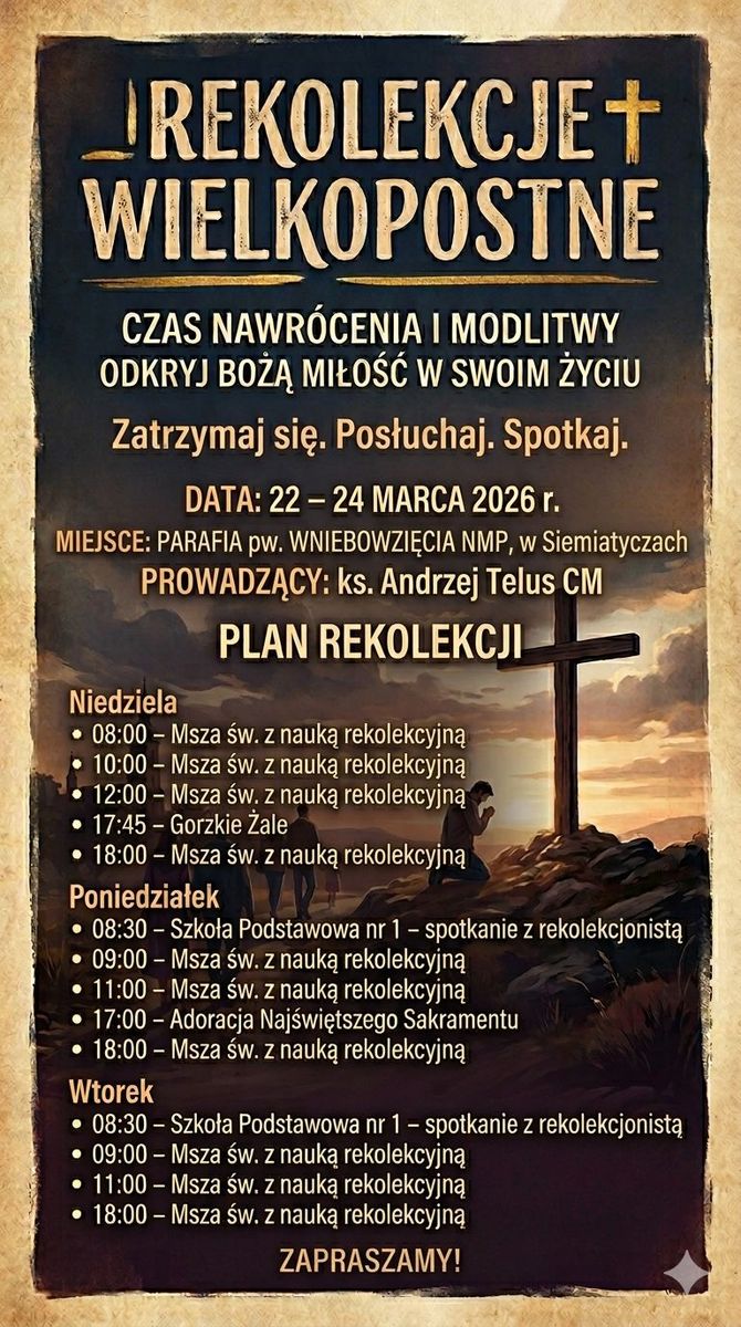 W parafii pw. Wniebowzięcia Najświętszej Maryi Panny w Siemiatyczach rozpoczęły się rekolekcje wielkopostne – wyjątkowy czas nawrócenia, modlitwy oraz odkrywania Bożej miłości w swoim życiu. Tegorocznym ćwiczeniom duchowym przewodniczy ks. Andrzej Telus CM.