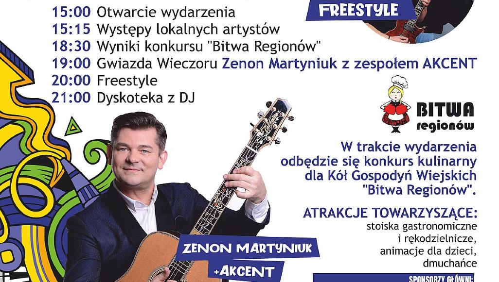 Program festynu przewiduje występy lokalnych artystów oraz zespołów z Gminnego Ośrodka Kultury w Sarnakach. Jako Gwiazda wieczoru, o godz. 19.00 wystąpi Zenon Martyniuk z zespołem. - Po występie naszego gościa pozostaniemy w klimacie muzyki tanecznej i dalej bawić się będziemy z zespołem Freestyle. Wieczór zakończy dyskoteka pod gwiazdami – informują organizatorzy.