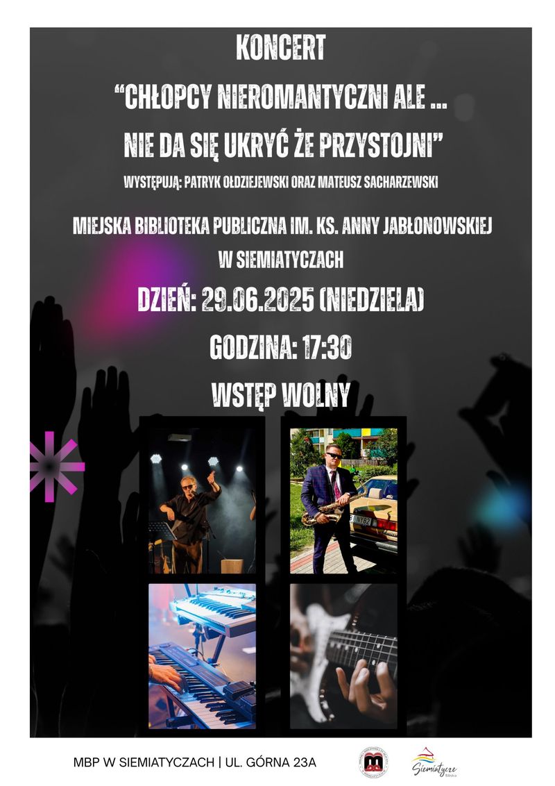 Koncert (Nie)Romantyczny w wykonaniu Mateusza Sacharzewskiego i Patryka Ołdziejewskiego, to propozycja Miejskiej Biblioteki Publicznej w Siemiatyczach. Koncert odbędzie się w niedzielę, 29 czerwca.