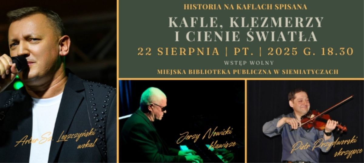 „KAFLE, KLEZMERZY I CIENIE ŚWIATŁA” to tytuł koncertu, którym Miejska Biblioteka Publiczna w Siemiatyczach otworzy weekend. W piątek, 22 sierpnia o godz. 18.30 w muzycznej opowieści, przywołującej ducha przedwojennego miasta i bogactwo polsko-żydowskiej tradycji, wystąpią: Artur Leszczyński – wokal, Jerzy Nowicki – instrumenty klawiszowe, Piotr Przydworski – skrzypce.