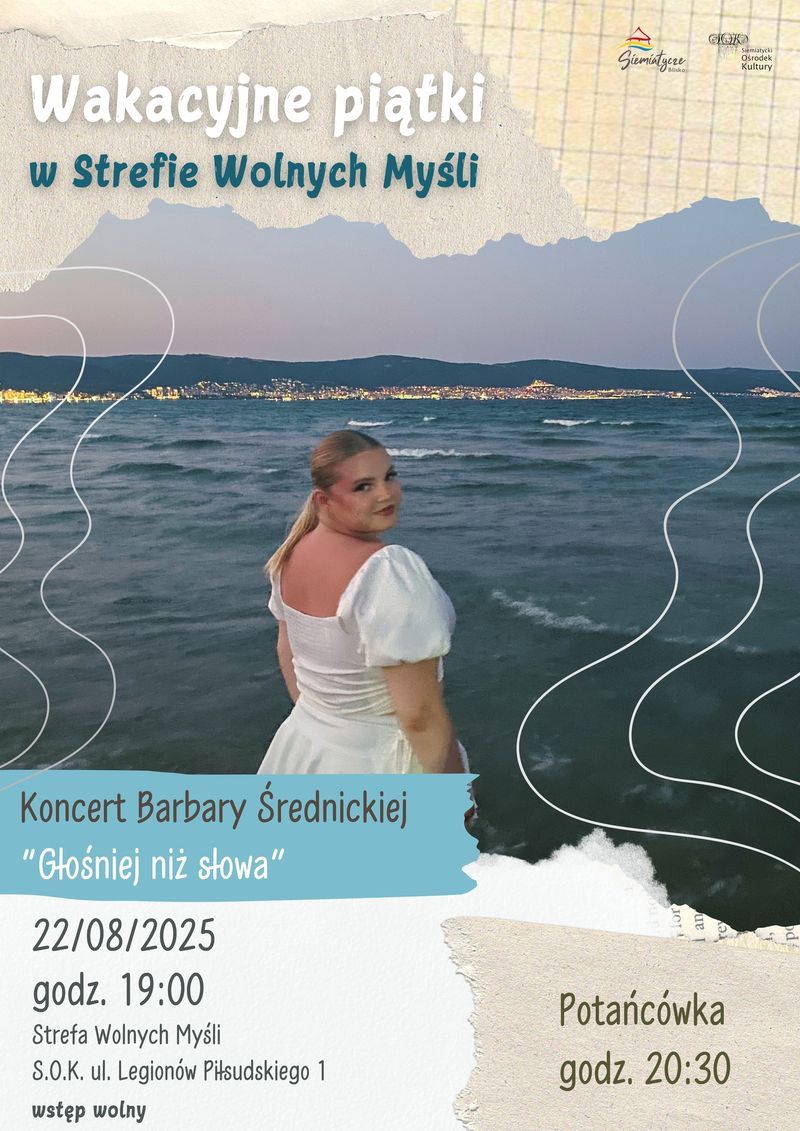 Także w piątek o godz. 19.00 w cyklu „Wakacyjne Piątki w Strefie Wolnych Myśli” w parku przy Siemiatyckim Ośrodku Kultury (ul. Legionów Piłsudskiego 1) wystąpi Barbara Średnicka z koncertem „Głośniej niż słowa”. Po koncercie o godz. 20.30 – potańcówka.