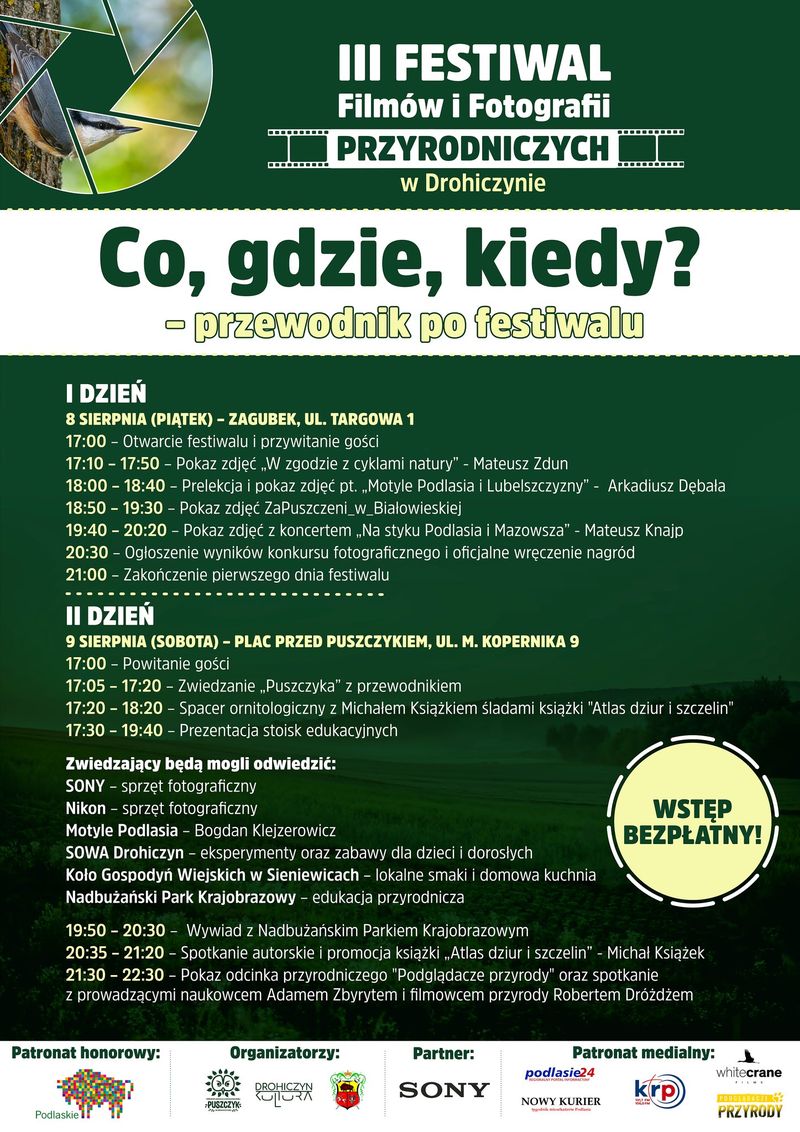 Festiwal Filmów i Fotografii Przyrodniczych to wydarzenie organizowane przez Miejsko-Gminny Ośrodek Kultury i Ośrodek Edukacji Ekologicznej Puszczyk w Drohiczynie oraz Gminę Drohiczyn. Jest okazję do zetknięcia z najpiękniejszymi przyrodniczymi zdjęciami wykonywanymi przez polskich fotografów. Prezentowane będą również filmy przyrodnicze. Można będzie spotkać się z fotografami i posłuchać ich pasjonujących opowieści o próbach utrwalenia w obiektywie tego, co ulotne i często niedostępne dla oka zwykłego śmiertelnika. Ich dzieła mają zazwyczaj nie tylko dokumentalny, ale także artystyczny charakter. W tym roku Festiwal połączono z piknikiem przyrodniczym, podczas którego odbędą się spotkania z pasjonatami przyrody, a także będą przygotowane różne stoiska edukacyjne.Organizatorzy zapraszają na:,