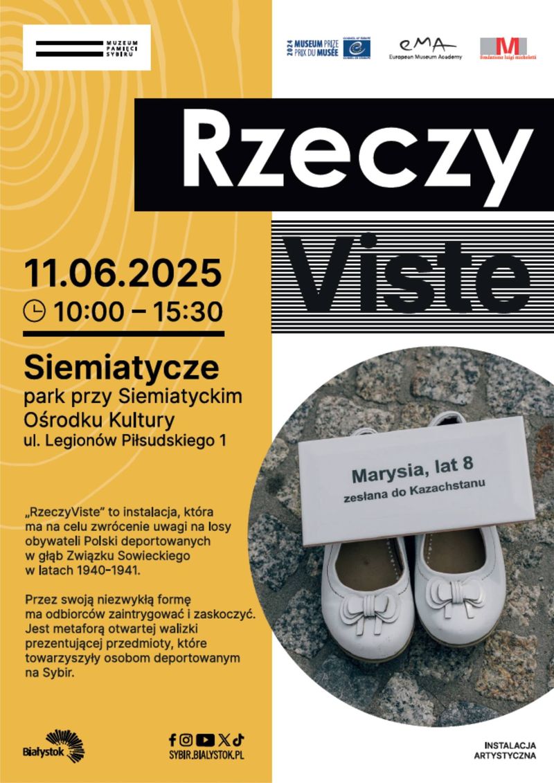 Aktualizacja: Jak informuje Muzeum Sybiru, ze względu na niekorzystne prognozy pogodowe, plenerowa instalacja „RzeczyViste” w Siemiatyczach zostaje przesunięta z 11 czerwca na 18 czerwca 2025 r. Miejsce i godzina pozostają bez zmian.