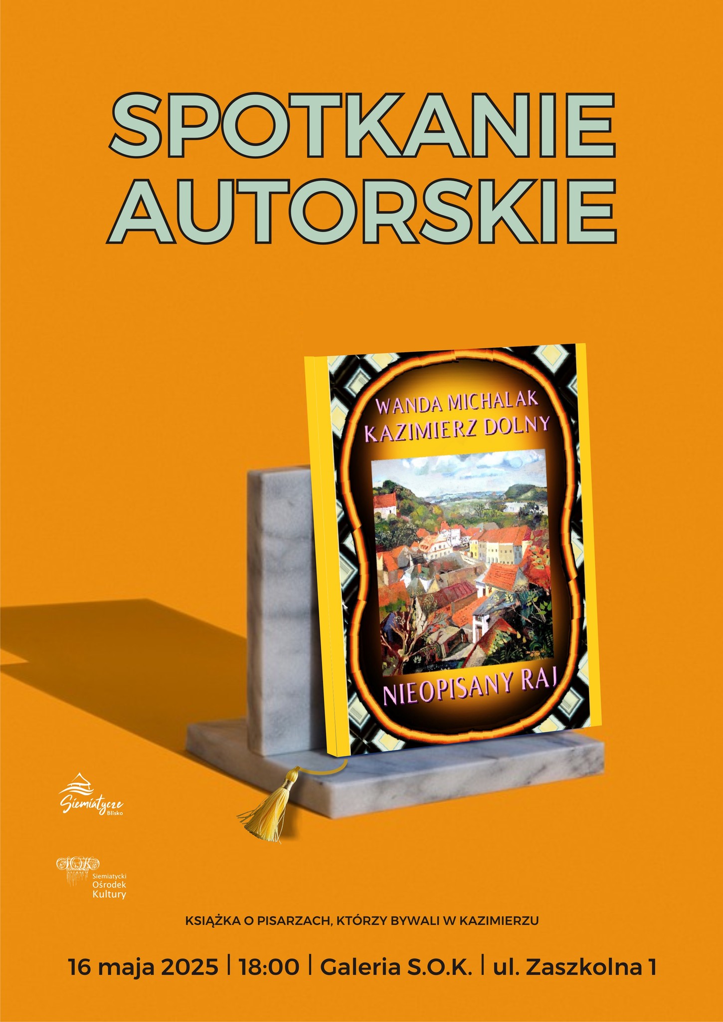 Spotkanie odbędzie się w piątek, 16 maja, o godz. 18.00 w Galerii SOK przy ul. Zaszkolnej 1. Wanda Michalak zaprezentuje swoją książkę pt. „Kazimierz Dolny, nieopisany raj”, w której opowiada o pisarzach odwiedzających to malownicze miasteczko.Uzupełnieniem wieczoru będzie wernisaż wystawy malarstwa Janusza Michalaka. Jak zapowiada artysta, większość zaprezentowanych prac pochodzi z kolekcji Eugenii Dąbrowskiej – mieszkanki Siemiatycz i częstej bywalczyni Kazimierza Dolnego.