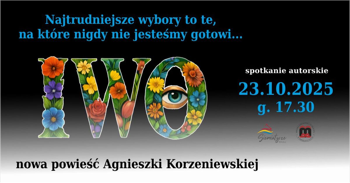 Spotkanie autorskie poświęcone będzie promocji najnowszej książki Agnieszki Korzeniewskiej pt. „Iwo”. Będzie okazją do rozmowy o literaturze, inspiracjach oraz procesie tworzenia powieści. Autorka opowie o kulisach powstania „Ivo” i o przesłaniu, jakie niesie ta historia.Agnieszka Korzeniewska, od lat obecna jest na scenie literackiej. Spod jej pióra wyszły tytuły cenione przez odbiorców w kraju i za granicą, jak „Zabiorę Cię jesienią do Brukseli”, „W deszczu tańcz!”, „Zaczarowana codzienność” i „Witraż”. Powieść „Iwo”, podobnie jak inne tytuły autorstwa Agnieszki Korzeniewskiej, została objęta patronatem medialnym Katolickiego Radia Podlasia i portalu podlasie24.pl.