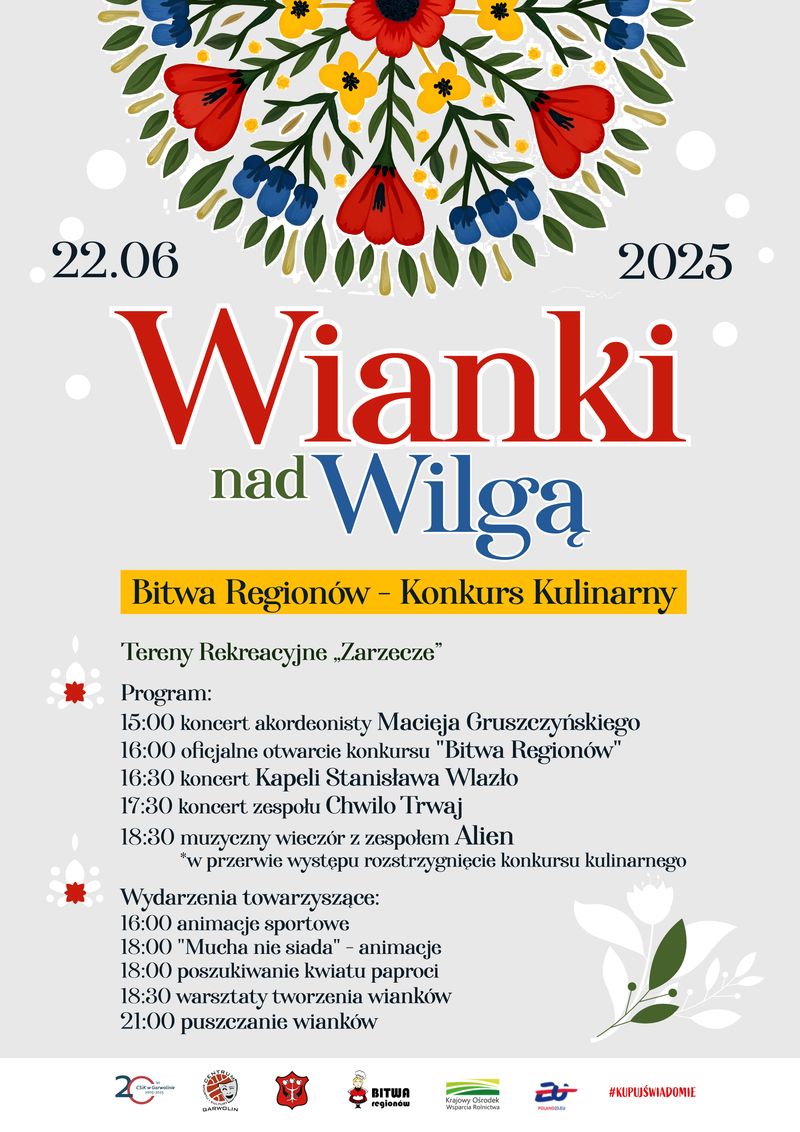 Na uczestników czeka bogaty program artystyczny i szereg wydarzeń towarzyszących. Świętowanie rozpocznie się o godzinie 15:00 koncertem akordeonisty Macieja Gruszczyńskiego, po którym nastąpi oficjalne otwarcie konkursu. Na scenie wystąpią również Kapela Stanisława Wlazło (godz. 16:30), zespół Chwilo Trwaj (17:30) oraz gwiazda wieczoru – zespół Alien, który zagra o 18:30. W trakcie występu odbędzie się ogłoszenie wyników kulinarnego starcia regionów.Organizatorzy zadbali także o wiele atrakcji dla rodzin i najmłodszych. Od godziny 16:00 dostępne będą animacje sportowe, a o 18:00 ruszy blok animacji „Mucha nie siada”. Tego samego wieczoru odbędą się również poszukiwania kwiatu paproci oraz warsztaty tworzenia wianków, które zakończą się symbolicznym i magicznym puszczaniem wianków na wodę o godzinie 21:00.