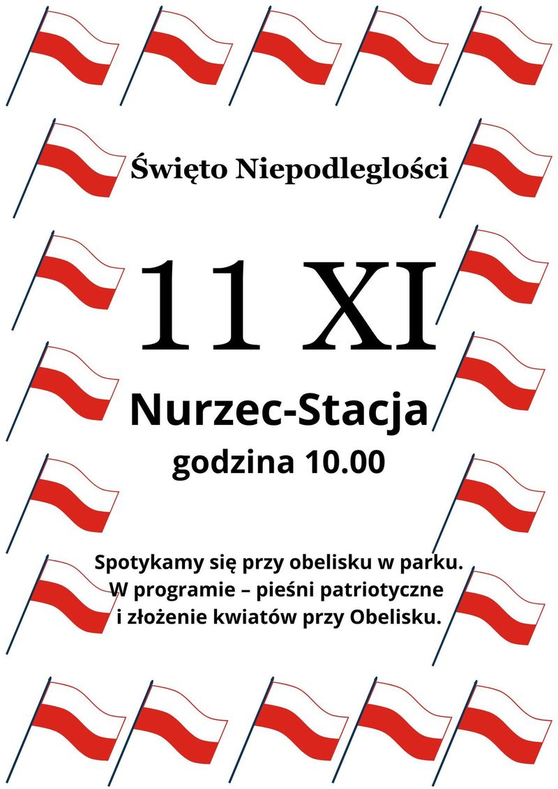 Wójt Gminy Nurzec-Stacja oraz Gminny Ośrodek Upowszechniania Kultury zapraszają do wspólnego świętowania 107. rocznicy Odzyskania Niepodległości w Nurcu-Stacji. Uroczystości rozpoczną się we wtorek, 11 listopada o godz. 10.00 przy obelisku w parku w Nurcu-Stacji.