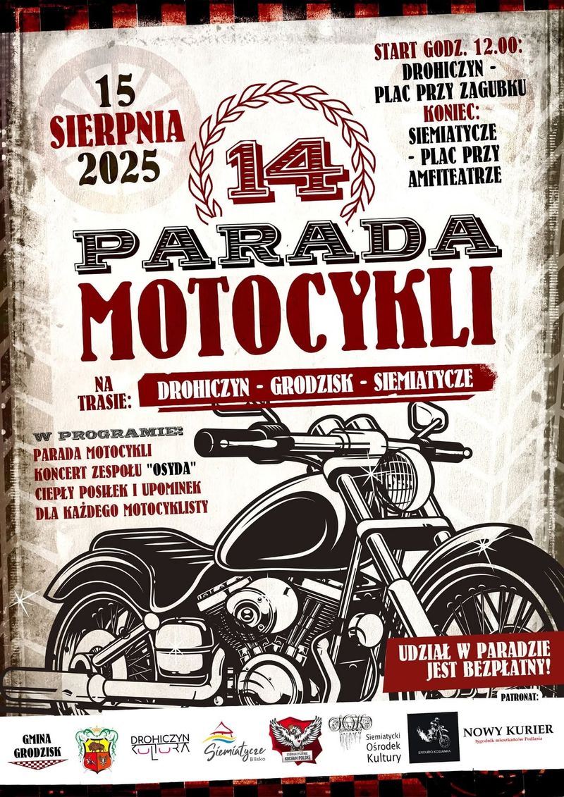 Parada Motocykli ruszy w piątek, 15 sierpnia o godz. 12.00 z placu przy Zagubku w Drohiczynie (ul. Targowa 1), przejedzie przez Grodzisk i zakończy się w amfiteatrze w Siemiatyczach. W programie: koncert, ciepły posiłek i upominek dla każdego motocyklisty. Parada Motocykli jest wspólną inicjatywą trzech samorządów: miasta i gminy Drohiczyn, gminy Grodzisk i miasta Siemiatycze. Współorganizatorem jest też Stowarzyszenie Kocham Polskę.