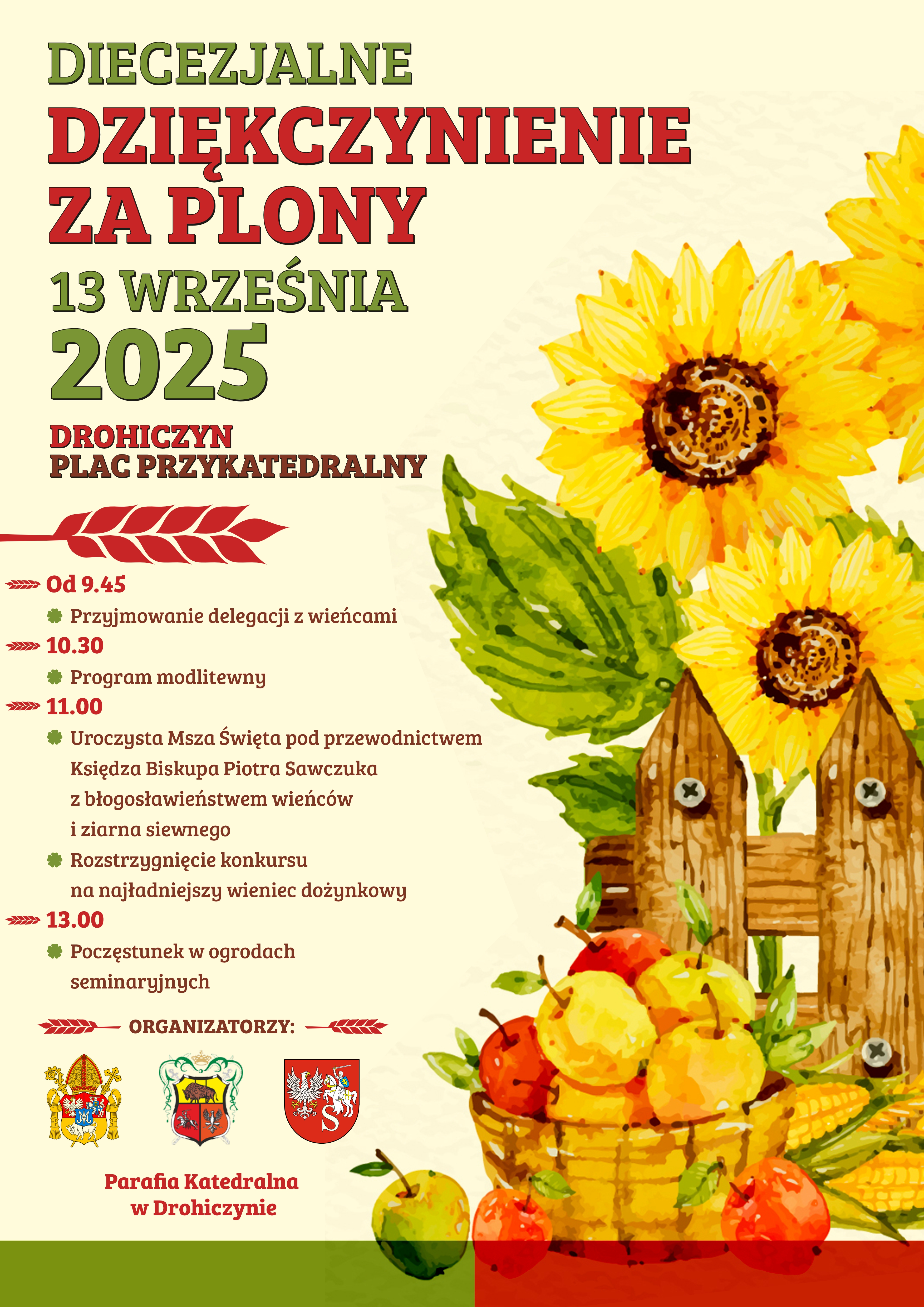 - 11:00 – Msza Święta na placu katedralnym z poświęceniem wieńców, ziarna siewnego i chlebów
