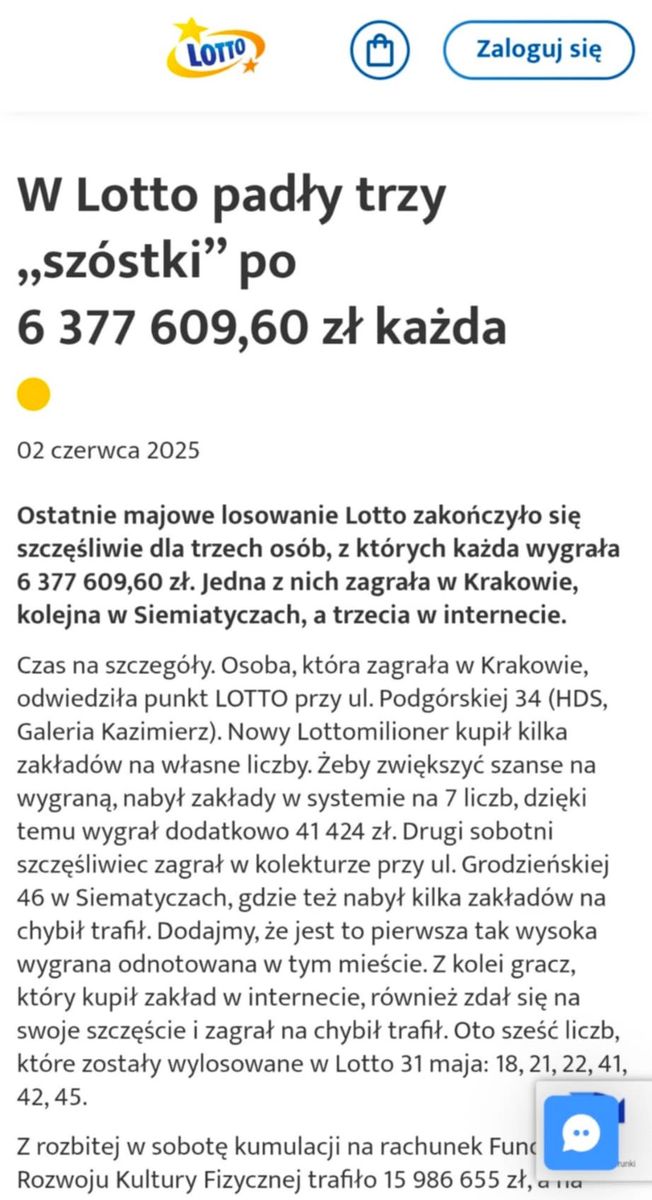 Szczęśliwy kupon wart jest 6 377 609,60 zł. W sobotnim losowaniu trafiono trzy szóstki, jedna z osób zagrała w Krakowie, kolejna w internecie, a jedna w Siemiatyczach. Gracze rozbili kumulację w której łącznie było do wygrania 19 mln zł.