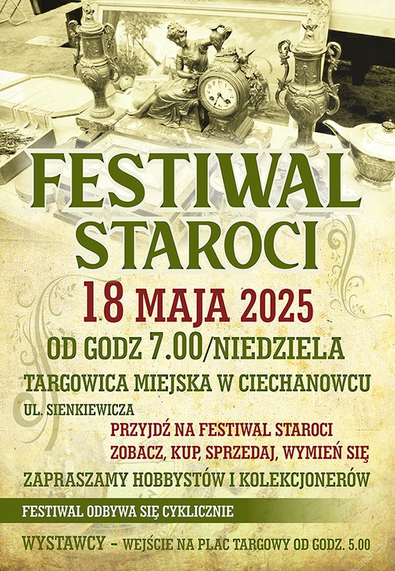 Co miesiąc, na Targowisku Miejskim w Ciechanowcu, spotykają się hobbyści, kolekcjonerzy, pasjonaci staroci i przedmiotów z duszą, doświadczeni handlowcy oraz nowicjusze, a także turyści. Kupują, sprzedają, wymieniają się zbiorami lub po prostu oglądają.Najbliższy Festiwal Staroci odbędzie się w niedzielę, 18 maja. Kolejny zaplanowano na 22 czerwca.