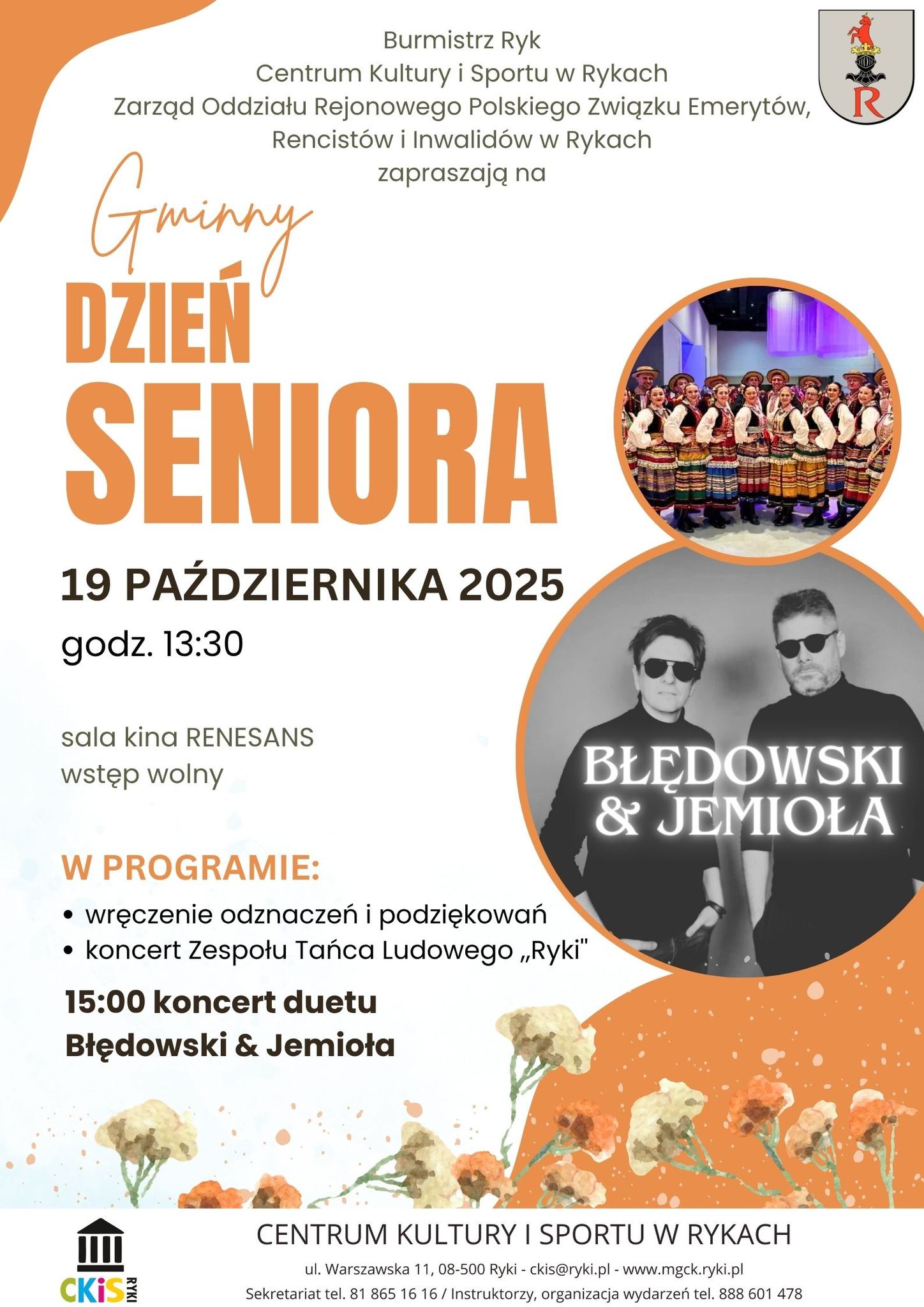 Wydarzenie rozpocznie się od wręczenia odznaczeń i podziękowań dla zasłużonych seniorów. Będzie to doskonała okazja, by uhonorować osoby, które swoją pracą, zaangażowaniem i życiową mądrością wniosły istotny wkład w życie lokalnej społeczności.W programie przewidziano także występ Zespołu Tańca Ludowego „Ryki”, a o godzinie 15:00 na scenie pojawi się duet Błędowski & Jemiła, który zaprezentuje publiczności koncert pełen muzycznych emocji.