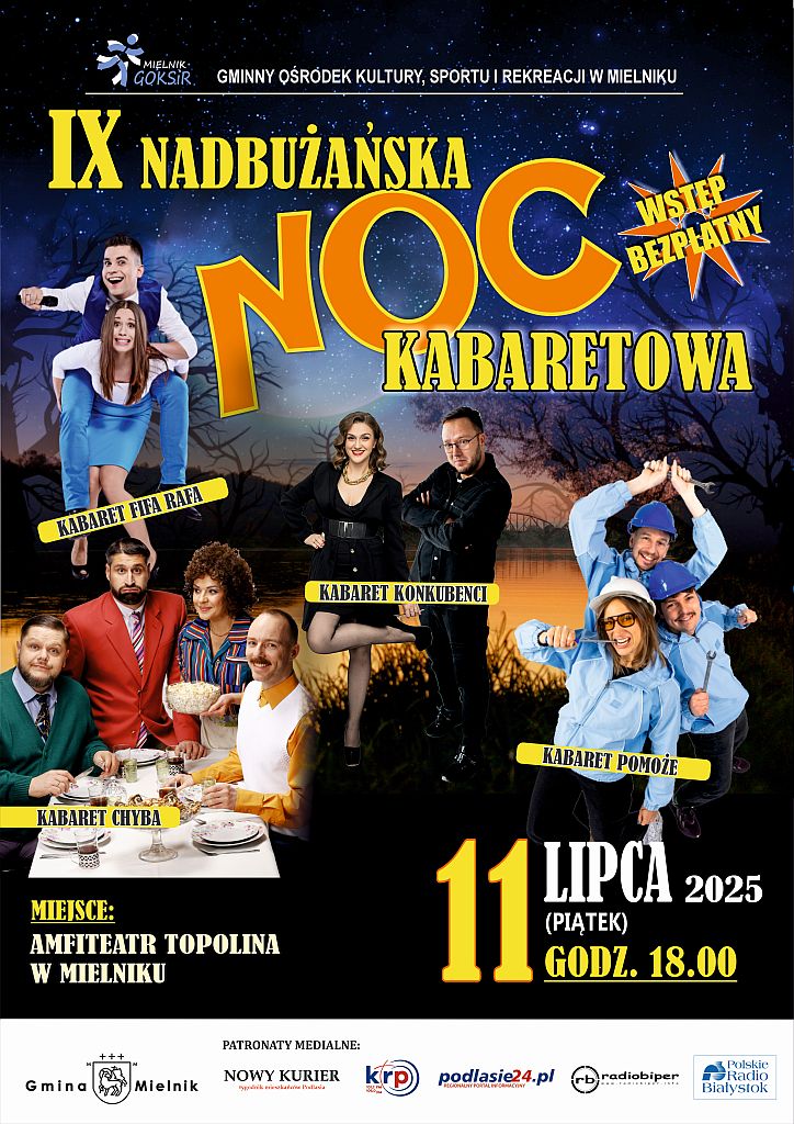 IX edycja Nadbużańskiej Nocy Kabaretowej odbędzie się w Amfiteatrze Topolina przy ul. Brzeskiej w Mielniku w piątek, 11 lipca. Wstęp jest bezpłatny.