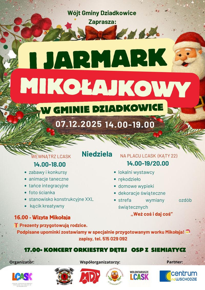 Jarmark odbędzie się w niedzielę, 7 grudnia, w Lokalnym Centrum Aktywności Społeczno-Kulturalnej w Dziadkowicach oraz na placu LCASK (Kąty 22).W godz. 14:00–18:00 (w budynku LCASK): zabawy i konkursy, animacje taneczne, tańce integracyjne, fotościanka, stanowisko konstrukcyjne XXL, kącik kreatywny.