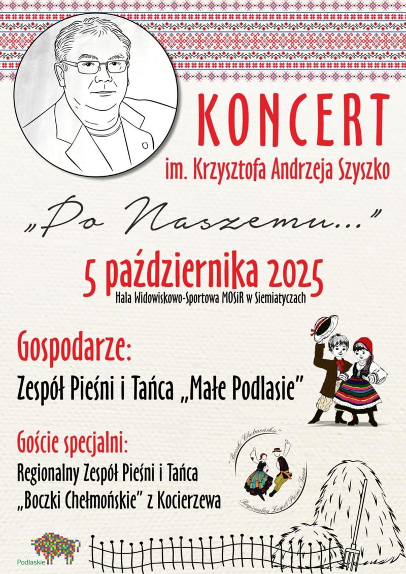 Koncert „Po naszemu…”, dedykowany pamięci druha, śp. Krzysztofa Andrzeja Szyszko, założyciela Zespołu Pieśni i Tańca „Małe Podlasie” odbędzie się 5 października w Hali Widowiskowo-Sportowej w Siemiatyczach..