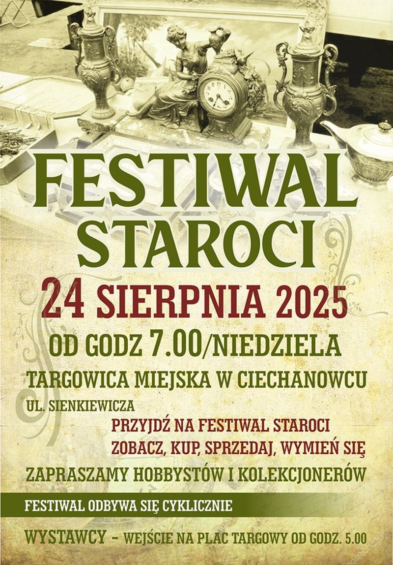 Ciechanowieckie spotkania hobbystów, kolekcjonerów, pasjonatów staroci i przedmiotów z duszą odbywają się przez cały rok. Zwykle w przedostatnią niedzielę miesiąca. Największe rozmiary festiwal osiąga latem. Teren targowiska zawsze otwierany jet o 5 rano, o godz. 7.00 targowisko jest już dostępne dla kupujących. I właśnie latem, gdy słońce wcześniej wstaje, już o poranku handelek idzie w najlepsze. W czasie wakacyjno-urlopowym Festiwal Staroci w Ciechanowcu pełni też rolę atrakcji turystycznej. Pojawia się wtedy w Ciechanowcu wielu turystów, którzy nawet jeśli nie planują zakupów, to chcą zobaczyć Festiwal, pospacerować alejkami na ryneczku, pooglądać cuda i cudeńka, jakie prezentują tu wystawcy.Festiwal Staroci w Ciechanowcu odbywa się raz w miesiącu. Najbliższy – 24 sierpnia, kolejny zaplanowano 21 września.