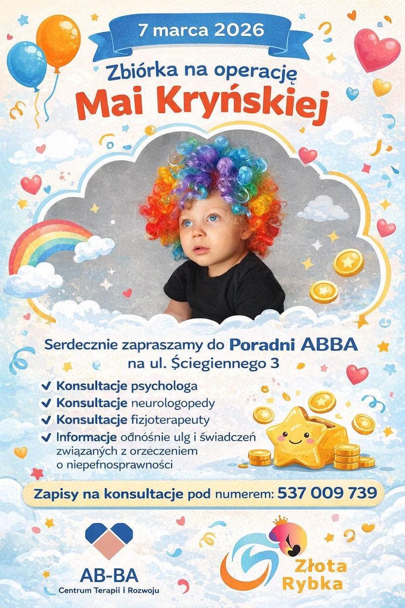 W sobotę, 7 marca, Poradnia AB-BA oraz Stowarzyszenie Złota Rybka zapraszają na dzień konsultacji specjalistycznych, z których całkowity dochód zostanie przeznaczony na operację Mai.