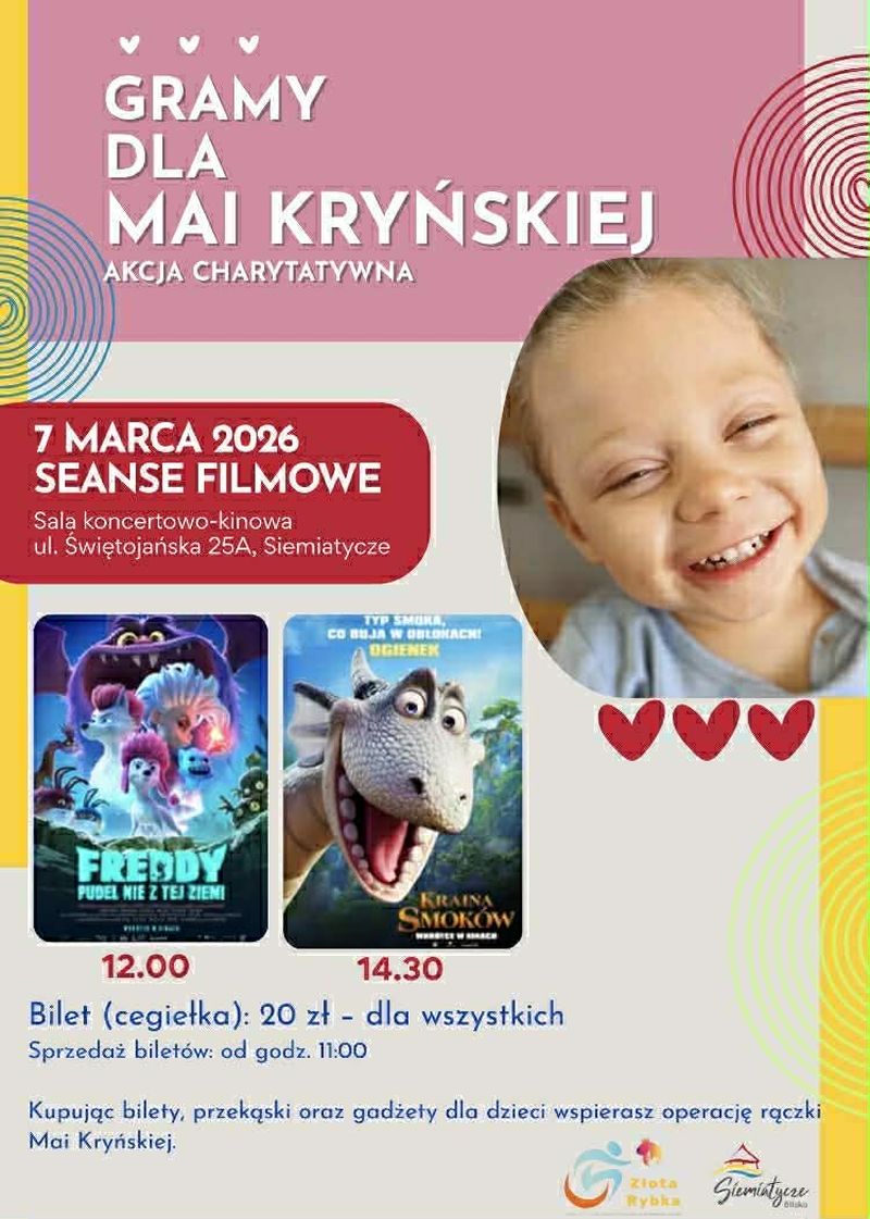 Tego samego dnia o godz. 12.00 i 14.30 w sali kinowej przy ul. Świętojańskiej odbędą się seanse filmowe dla dzieci. Dochód ze sprzedaży biletów-cegiełek również wesprze leczenie dziewczynki.