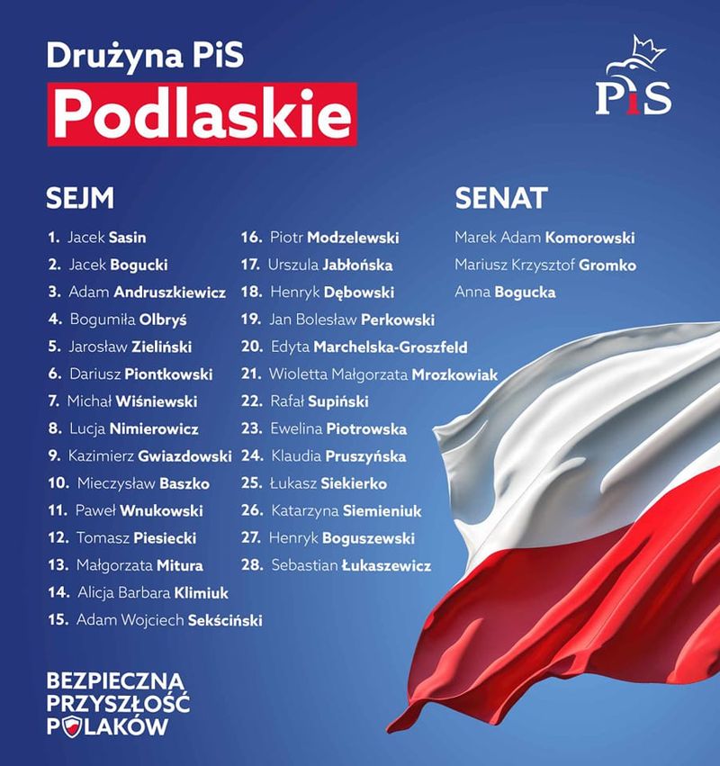 Jacek Sasin jest liderem na podlaskiej liście kandydatów do Sejmu, drugą pozycję na liście zajął senator Jacek Bogucki, trzecią wiceminister cyfryzacji Adam Andruszkiewicz. Z czwartego miejsca o mandat poselski zabiegać będzie Bogumiła Olbryś, dyrektor Zespołu Szkół Weterynaryjnych w Łomży, prywatnie żona wicemarszałka województwa podlaskiego Marka Olbrysia. Piątka, to poseł Jarosław Zieliński, z szóstego miejsca startuje wiceminister edukacji Dariusz Piontkowski.