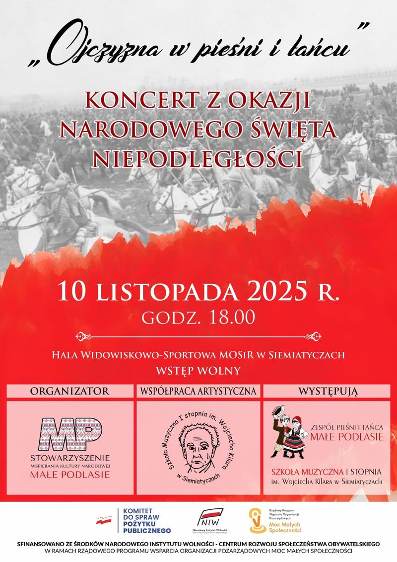 10 listopada (poniedziałek), 18:00 – Koncert pt. „Ojczyzna w pieśni i tańcu”. Wystąpią Zespół Pieśni i Tańca Małe Podlasie oraz uczniowie Szkoły Muzycznej I stopnia im. Wojciecha Kilara w Siemiatyczach, hala widowiskowo-sportowa, ul. Świętojańska 25a