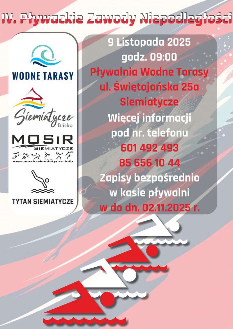 9 listopada (niedziela), 9:00 – IV Pływackie Zawody Niepodległościowe, pływalnia Wodne Tarasy, ul. Świętojańska 25a