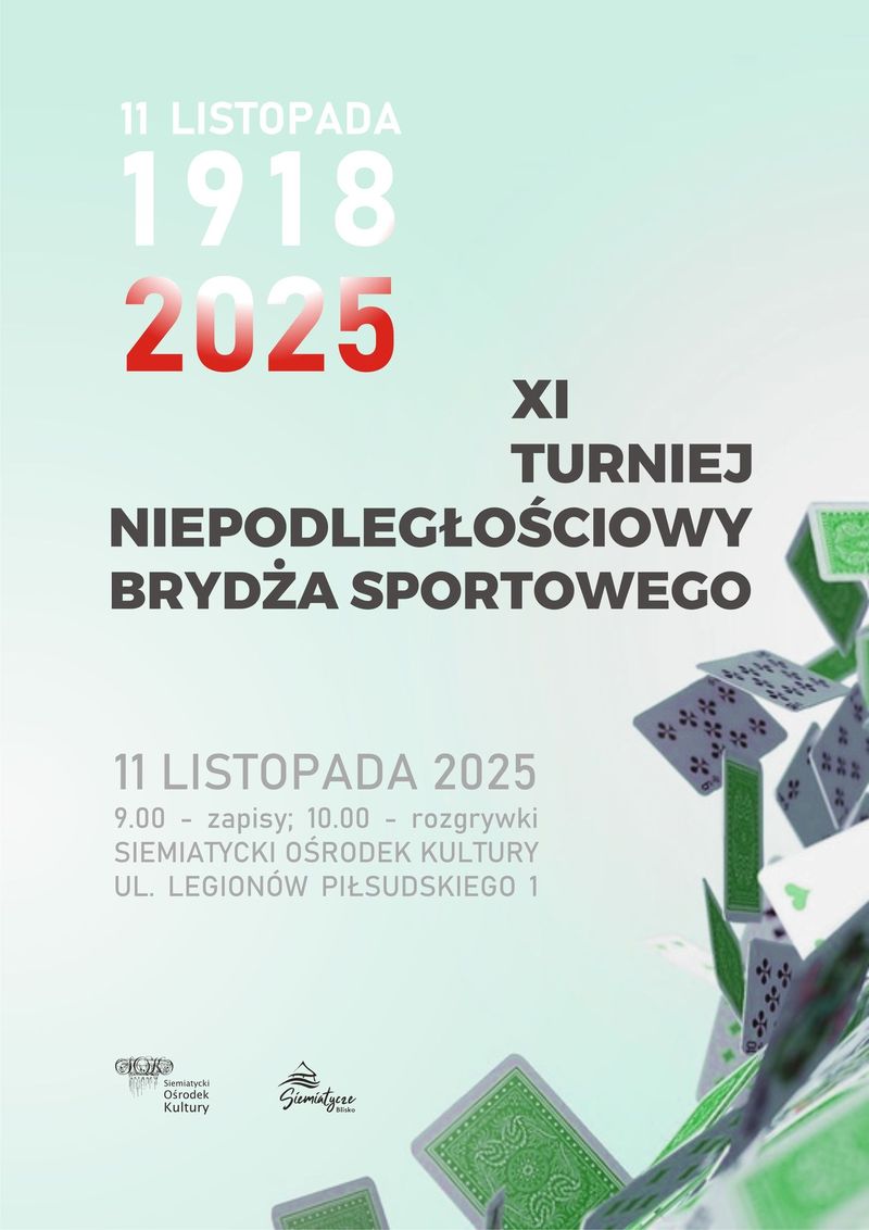 11 listopada (wtorek), 10:00 - XI Turniej Niepodległościowy Brydża Sportowego, ul. Legionów Piłsudskiego 1