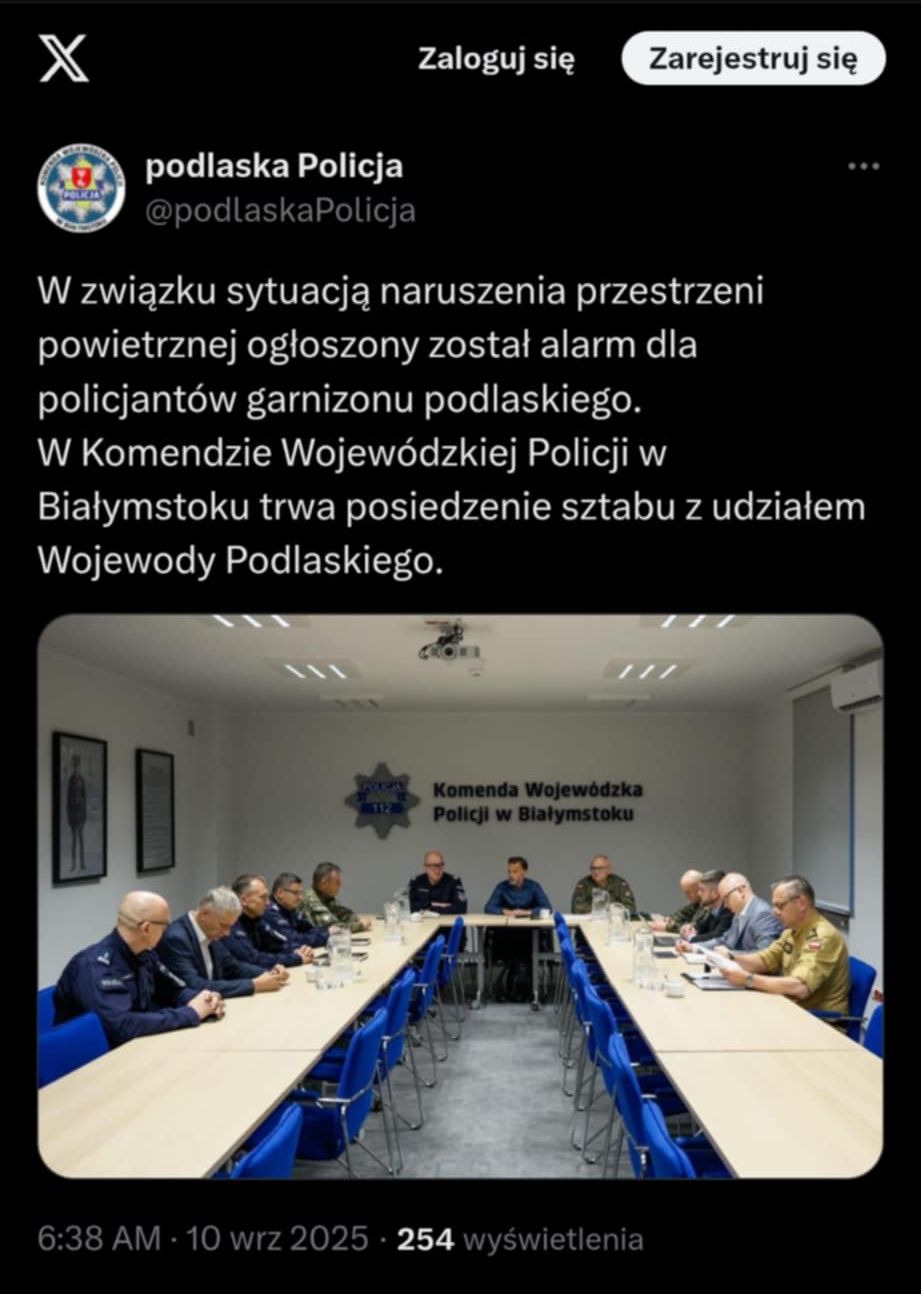 W związku z sytuacją naruszenia przestrzeni powietrznej został ogłoszony alarm dla policjantów garnizonu podlaskiego. W Komendzie Wojewódzkiej Policji w Białymstoku trwa posiedzenie z udziałem wojewody podlaskiego – informuje na platformie X Podlaska Policja.