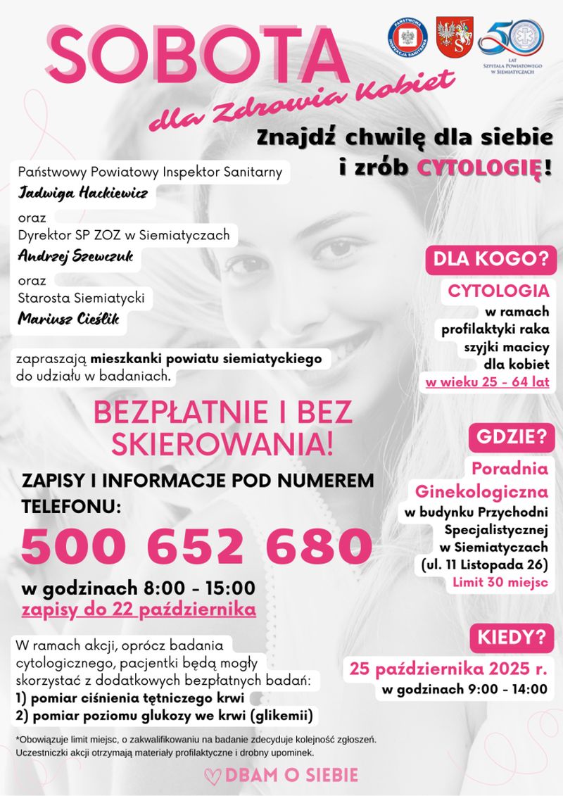 Znajdź chwilę dla siebie i zrób cytologię, przekonują organizatorzy „Soboty dla zdrowia kobiet”. Już w sobotę, 25 października mieszkanki powiatu siemiatyckiego będą mogły wykonać badanie cytologiczne oraz pomiar ciśnienia tętniczego krwi i pomiar glikemii.