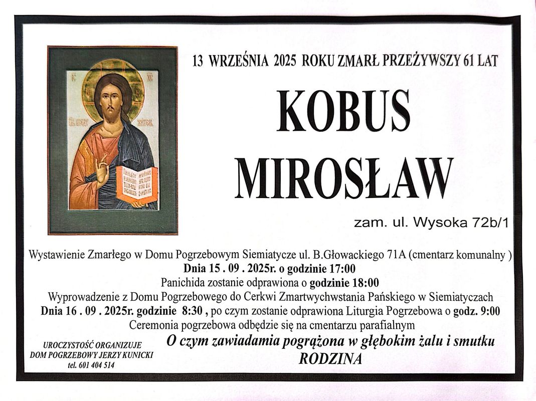 W wieku 61 lat zmarł Mirosław Kobus, wieloletni nauczyciel, wychowawca i trener. Był działaczem na wielu płaszczyznach, a w latach 2002 – 2010 pełnił funkcję radnego Rady Miasta Siemiatycze. Odszedł 13 września.