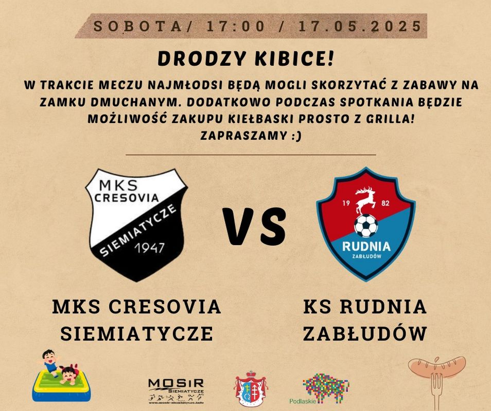 W sobotę, 17 maja MKS Cresovia Siemiatycze podejmie u siebie drużynę KS Rudnia Zabłudów w ramach 26. kolejki Podlaskiej Klasy Okręgowej.