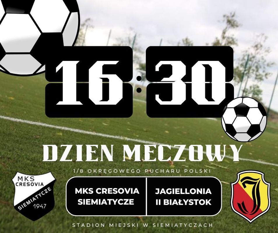 Zapowiadają się pucharowe emocje na Nadrzecznej w Siemiatyczach. W ramach 1/8 Okręgowego Pucharu Polski Cresovia Siemiatycze podejmuje u siebie Jagiellonię II Białystok.