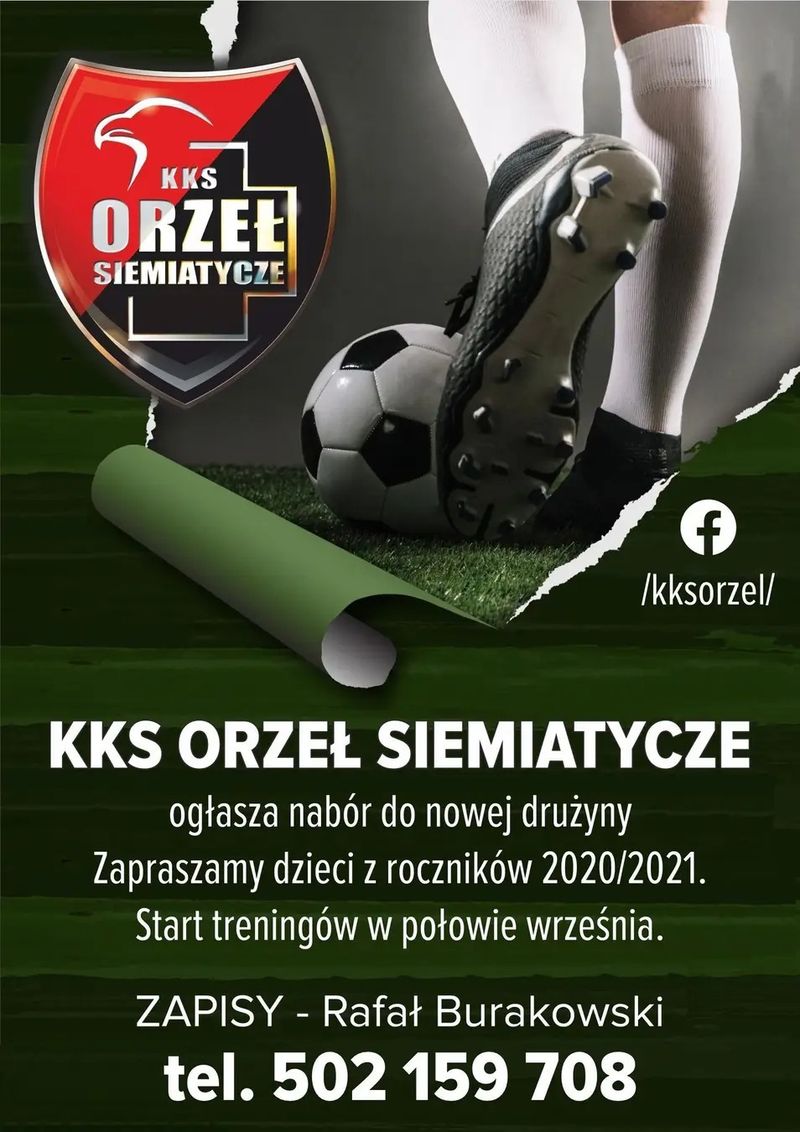 KKS Orzeł Siemiatycze prowadzi nabór do drużyny – będzie to nowa grupa, którą utworzą dzieci urodzone w latach 2020–2021. Trenerem grupy będzie Łukasz Misiuk. Zapisy prowadzi Rafał Burakowski, nr tel. 502 159 708.Pierwsze zajęcia zaplanowano w czwartek, 11 września, o godz. 16.30 na boisku Orlik przy Szkole Podstawowej nr 1.